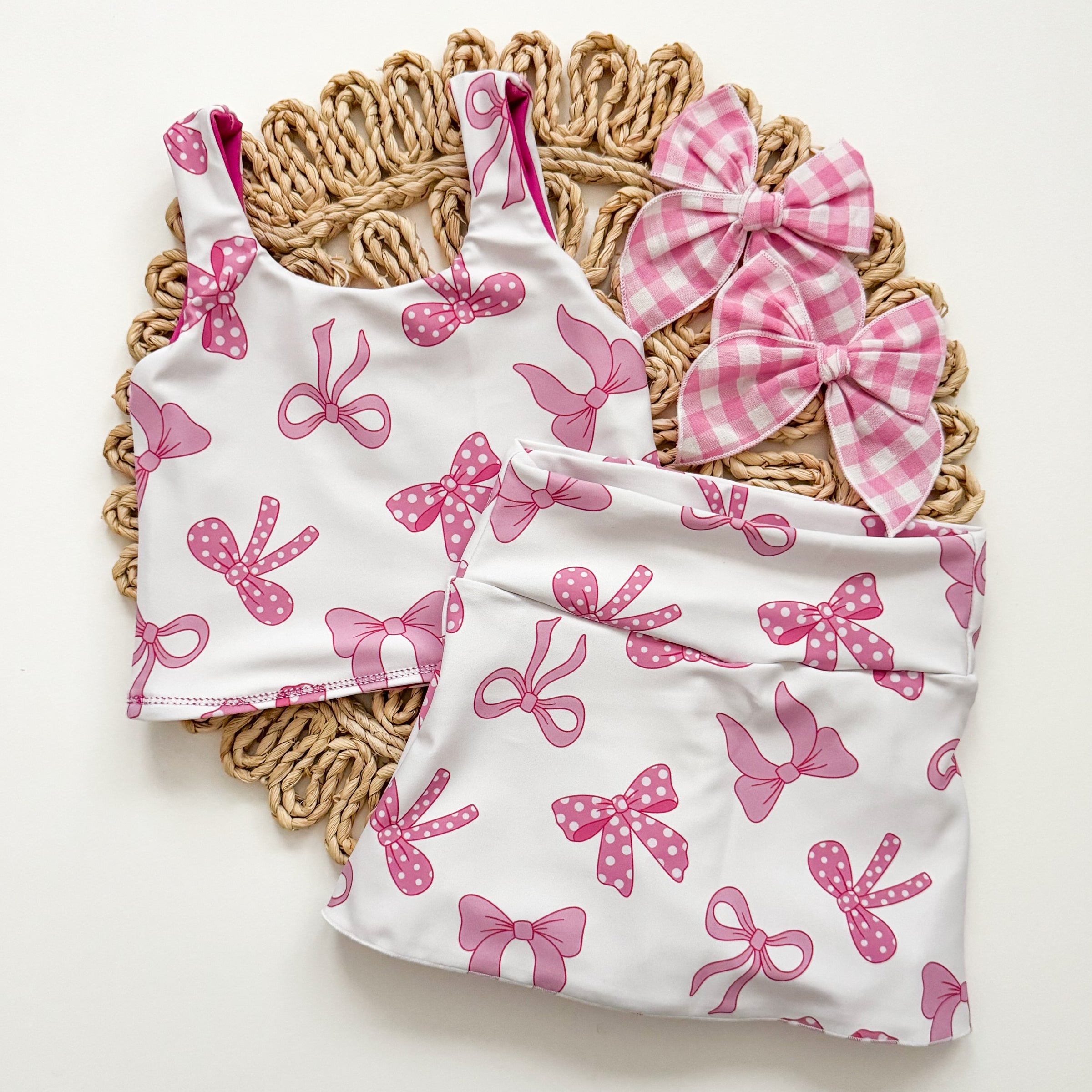 Top is reversible to pink. Bottoms have connected shorts.